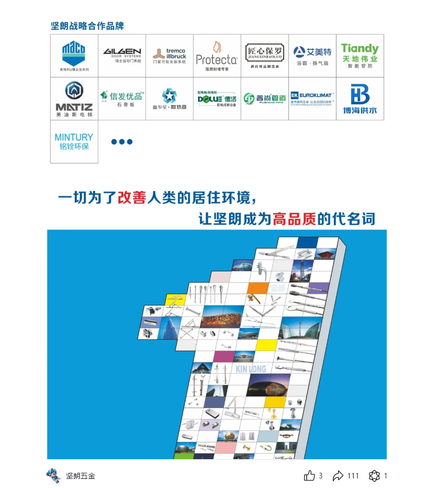 堅(jiān)朗五金作為一家A股上市公司,是建筑行業(yè)領(lǐng)先的配套集成供應(yīng)商。堅(jiān)朗生產(chǎn)基地建筑面積超過90萬㎡,公司員工總數(shù)超過16000人,60多家子公司。公司在國內(nèi)外設(shè)有近1000個(gè)銷售服務(wù)機(jī)構(gòu),產(chǎn)品遠(yuǎn)銷100多個(gè)國家和地區(qū)。經(jīng)過多年的發(fā)展,堅(jiān)朗已成為建筑領(lǐng)域的著名品牌。